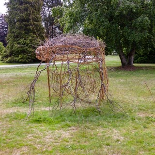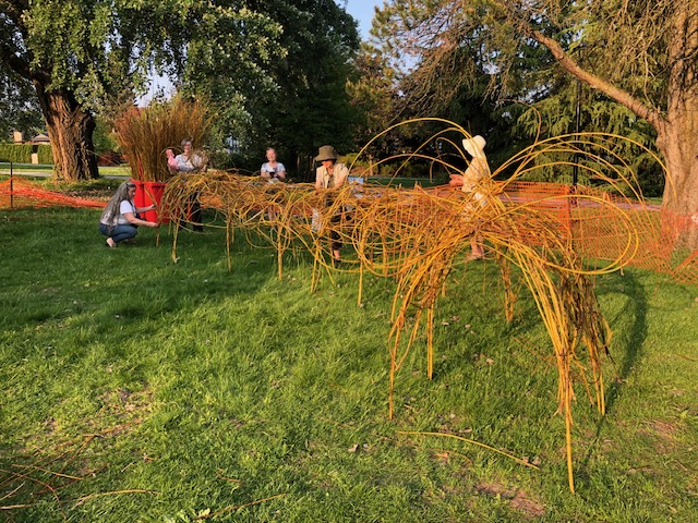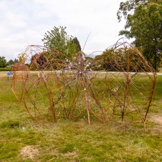 All of the bugs are created from imagination. Adornments made from rattan, dried blueberry shrubs, feathers and wire mesh helped to create the details on these creations made of willow.